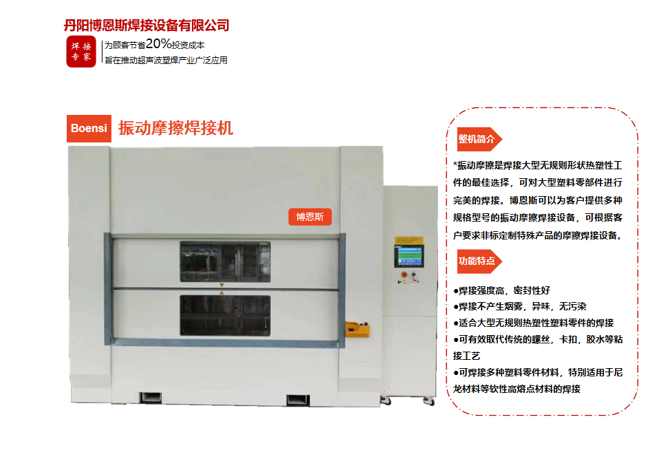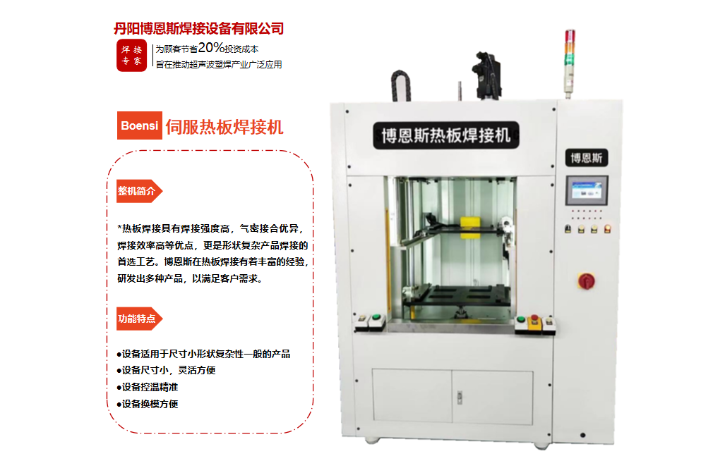 丹陽(yáng)博恩斯焊接設(shè)備有限公司是塑料焊接領(lǐng)域集研發(fā)設(shè)計(jì)、生產(chǎn)制造、銷售服務(wù)為一體的企業(yè)。公司自成立以來(lái)堅(jiān)持“以人為本”的理念,組織了一支強(qiáng)大的技術(shù)研發(fā)團(tuán)隊(duì),攜多年來(lái)積累的豐富經(jīng)驗(yàn),并結(jié)合國(guó)際先進(jìn)塑料焊接技術(shù),根據(jù)市場(chǎng)需要,不斷開發(fā)具有核心競(jìng)爭(zhēng)力的新產(chǎn)品。公司具有很強(qiáng)的非標(biāo)機(jī)械研發(fā)、設(shè)計(jì)、生產(chǎn)能力,可為廣大客戶定制各類專用機(jī)械設(shè)備。公司設(shè)計(jì)生產(chǎn)的塑料焊接設(shè)備已廣泛應(yīng)用于汽車、電子、家電、醫(yī)療器械、無(wú)紡布...